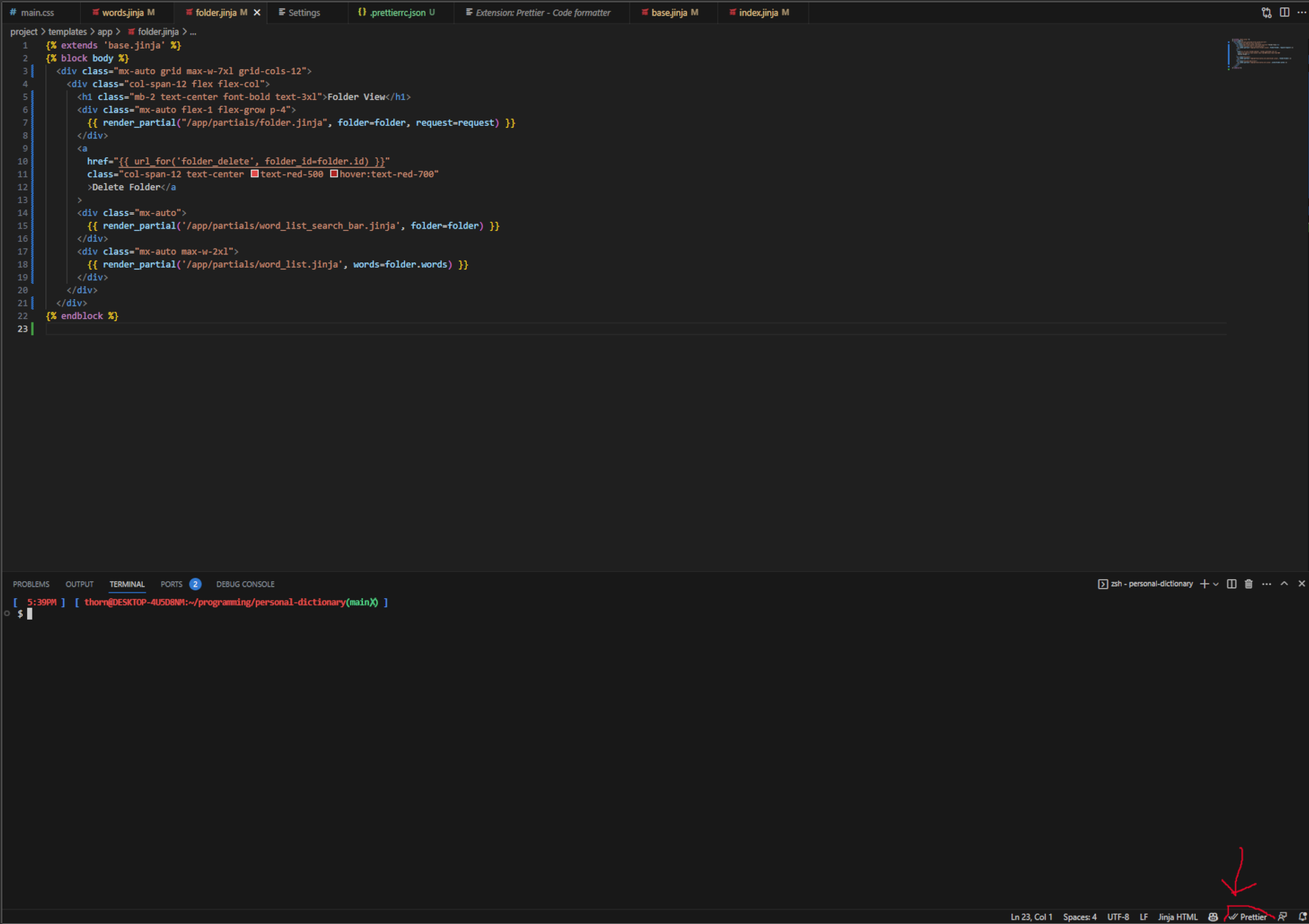 npm install -D prettier prettier-plugin-tailwindcss prettier-plugin-jinja-templateEnsure VSCode Prettier plugin is installed: