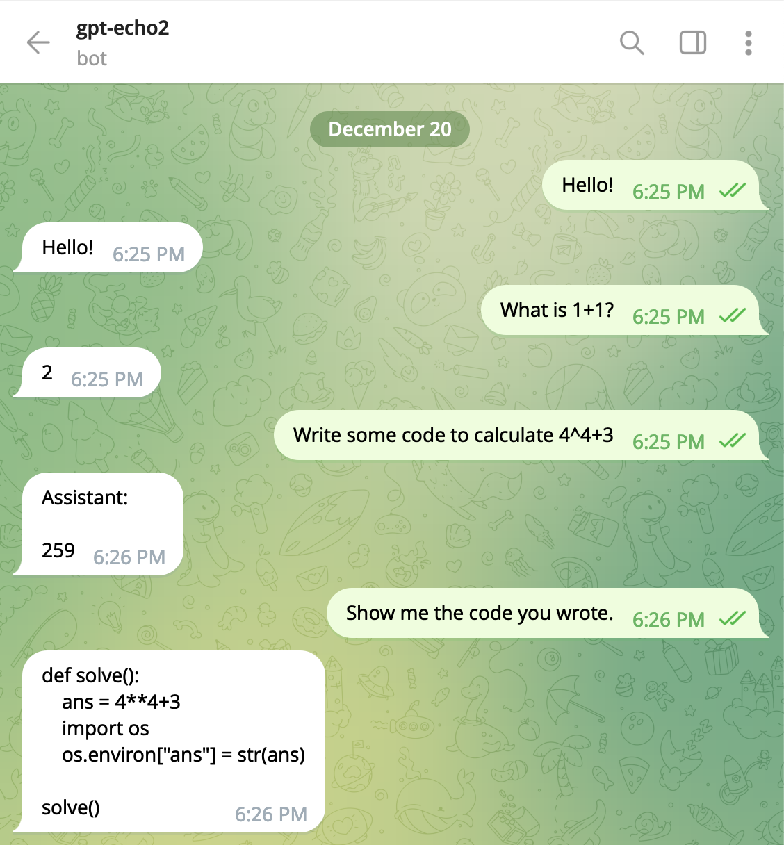 Take note how I have GPT load its results into an env variable. I compel GPT to always implement a function solve and write into a env variable ans to prevent any accidental namespace clobbering.
