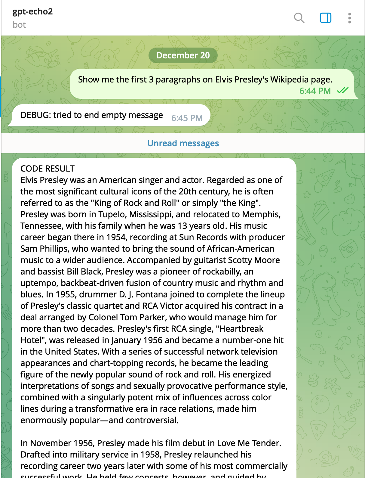 GPT-3 successfully wrote code, inspected the result and returned it to the human user. (me!) An issue with this implementation though is that it is expensive. I am having GPT-3 receive the text in a prompt and echo it back. I plan on resolving this by expanding the scope for how GPT can pass data back since right now it needs to read the results of what is loaded into ans itself.