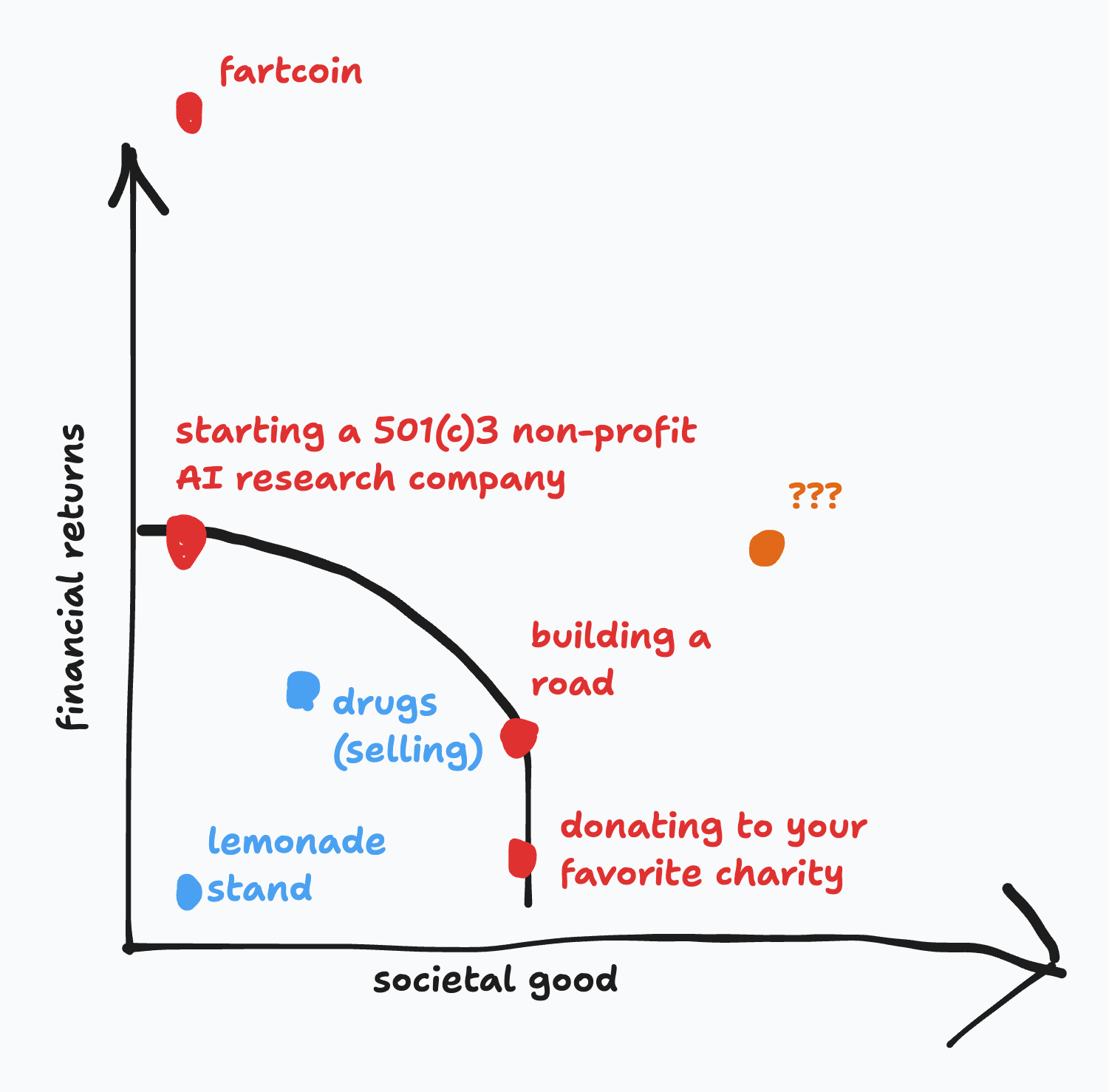 On a time+cash normalized basis, the expected socioeconomic returns frontier might be described by the black-colored arc here, with two outliers: Fartcoin and the great unknown. If you can do a crypto rug, do it. For the rest of us, we need to consider the great unknown. Is there something that has greater social impact than building a road for equal or greater financial returns? Is there something with greater financial returns that has an equal social impact? Print out this graph and label where some of your daily activities might fall. Does anything push the frontier? So long as you normalize 1 unit on the social good axis to equal 1 unit on the financial returns axis, you should only ever choose to do something along this frontier.