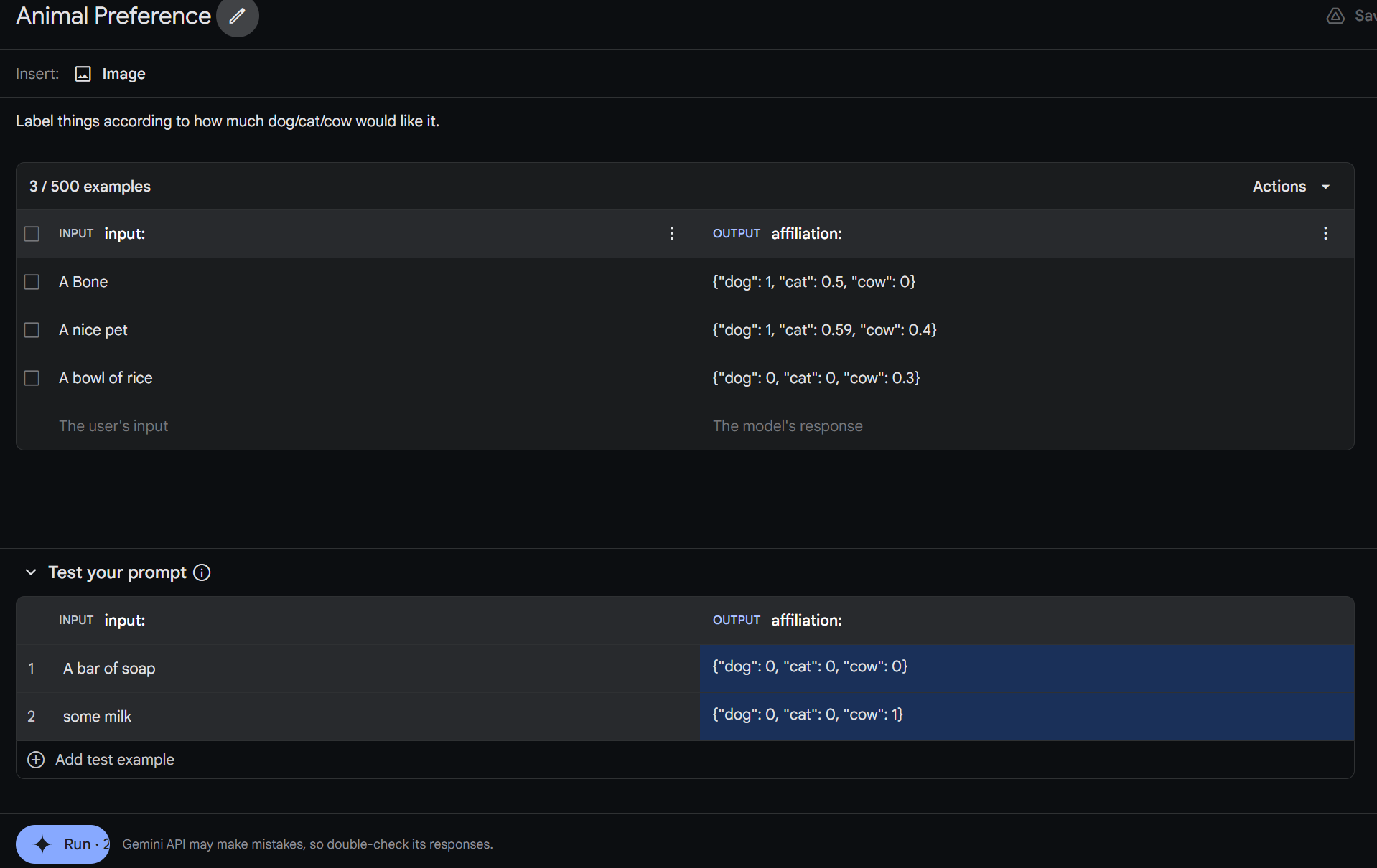 I don't want to write code every time I want to do something like label(input data, structure, example labelings). This Gemini structured prompt interface is so close. If i could freeze this and execute it against a google sheet, that would be great.